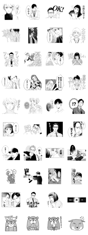 「私たちが恋する理由」の公式スタンプ。メッセージの汎用性は高いが全てのスタンプがマンガ調の白黒であるため、使い所は少し選びそう。ボリューム感があるのは嬉しい。