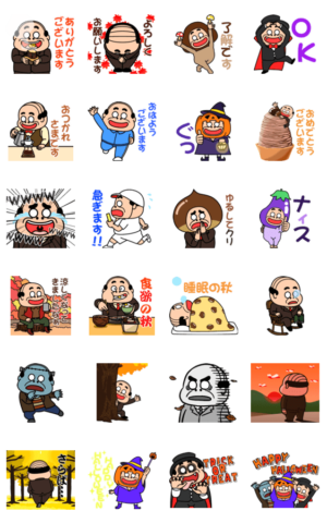昭和のおじさん、飛び出すスタンプの秋バージョンです! 【ハロウィン】【焼き芋】【紅葉】など、これからの季節使いやすい内容です。竹本友二 より発売