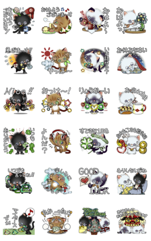 ポップにハツラツ動く!透明感のあるにぎやかな背景♬何気ない日常会話のやり取りに毎日使えます。キラキラな目の黒猫さん、シャムちゃん、トラちゃん、白猫さんです!NONO より発売