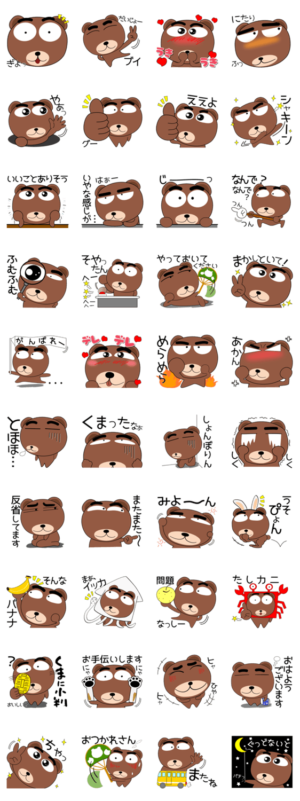 クマ(熊)のスタンプ。毎日よく使う言葉を揃えました。会社でも家族でもカップルでも。ダジャレも敬語もあるよ。朝から晩までずっと使えます。そんなバナナ!たしカニ