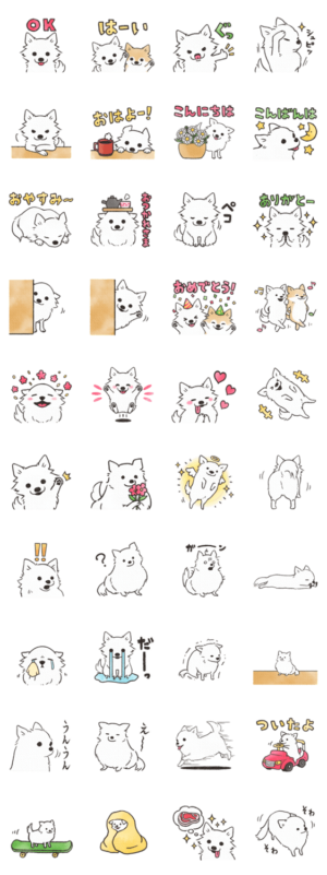 よく使う言葉やポーズを集めた、ほのぼのシンプルなワンちゃんのスタンプ40個セットです。白い犬、チワワ、ポメラニアン好きの方へどうぞ。