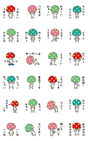 手描きのカラフルなきのこが動くアニメーションスタンプ(ごきげん編)。ご機嫌な気分の日常生活で結構使えてお役立ちのかわいいきのこです。きのこ好きの方ぜひどうぞ。