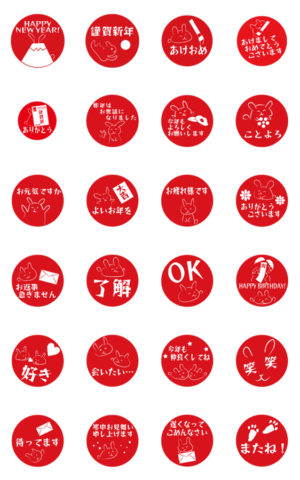 2023年(令和5年)の干支はうさぎ年(卯年)印鑑(はんこ)風ポップアップスタンプ。冬(年末年始正月)や日常で活躍スタンプ。誕生祝は年男、年女の方に向けても。※2023/1/3(火)23:59までに購入すると特典「LINEおみくじ」がもらえます。うどんみかん より発売