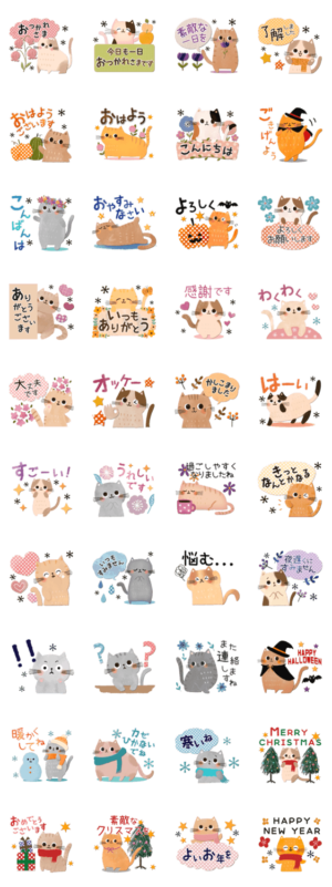毎年ずっと使える秋冬のゆるねこスタンプです。日常スタンプから、ハロウィン、クリスマス、年末年始にも!おはよう/おつかれさま/よろしく/ありがとう/感謝/オッケー
