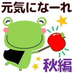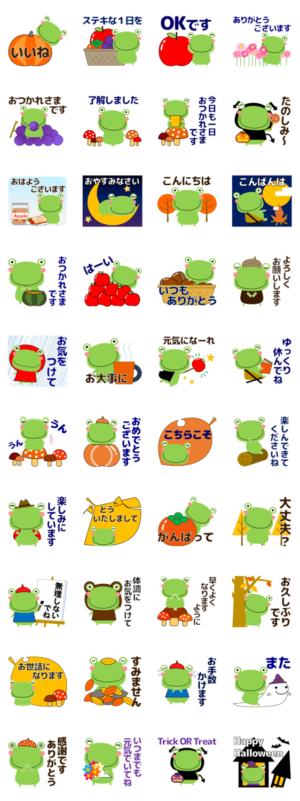 縁起のいい、幸せを呼ぶ「無事にカエル」のゆるいかわいいスタンプ。秋の果物(リンゴ、かぼちゃ、柿)、ハロウィン、敬老の日。優しい気持ち日常会話に使いやすい。敬語