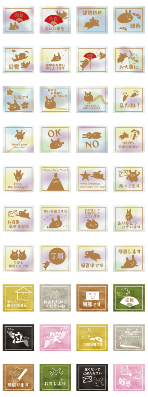 冬用(お正月、クリスマスなど)兎(うさぎ)のラインスタンプ。シンプルでビジネスにも。英語と日本語あり。2023年(令和5年)の干支はうさぎ年(卯年)うどんみかん より発売