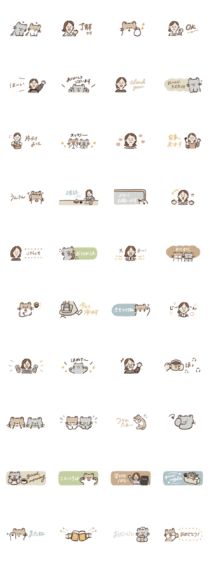 家族やママ友のやりとりに”ちょうどいい”敬語も含めた40個のスタンプ。OURHOME/Emiと猫のイラスト。文字はEmiの手書きデザイン。OURHOME より発売