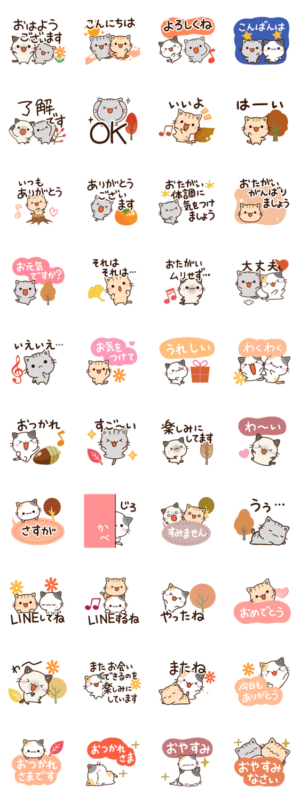秋の情景とネコちゃん達の可愛らしさが凝縮している素敵なスタンプです。にゃんにゃん具合にとても癒されますね。