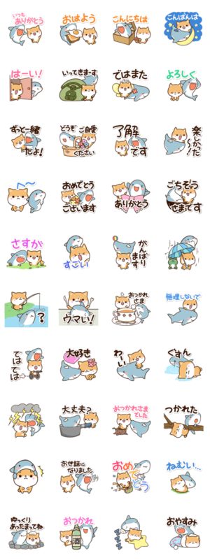 柴犬の『ちびシバ』とかわいい鮫キャラの『ちびサメ』。可愛く返事ができます。毎日使う言葉や、あいさつ等の、ずっと使える、さめとネコのスタンプです。【かたこ】かたこ より発売