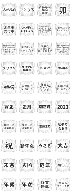2023年のお正月に向けたやつです。クリスマスと年末にも使えるスタンプを掲載。寅年。あけおめスタンプ2023。漫画風の集中線、効果線で正月から印象付けよう!謹賀新年!※2023/1/3(火)23:59までに購入すると特典「LINEおみくじ」がもらえます。みやや より発売