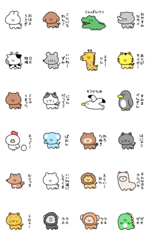 動く動物スタンプ。うさぎ/犬/トイプー/ワニ/キリン/虎/くま/ペンギン/ねこ/黒猫/たぬき/リス/ライオン/アルパカ/ゴリラ/猿/恐竜/はにゃ?/死語/昭和/平成/おやじギャグ