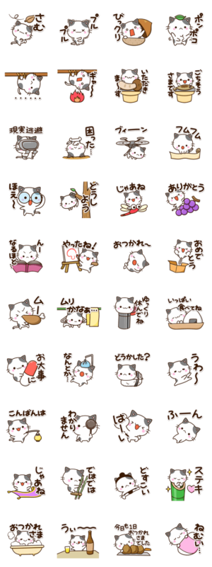 ぶち猫の『ちびブチ』の秋の雰囲気の、ねこスタンプです。可愛く返事ができます。毎日使う言葉や、あいさつ等の、おもしろく、ずっと使える、ネコのスタンプです。かたこ より発売