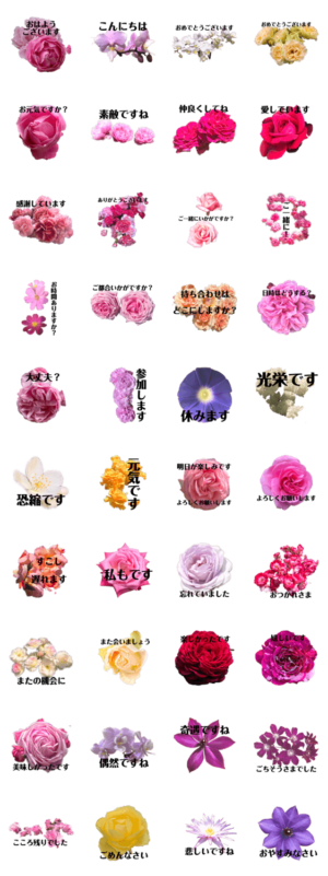 バラ、ラン、カーネーション、クレマチス等、綺麗で美しい花が言葉に添えられています。(丁寧、敬語、デート、気持ち)mamael より発売