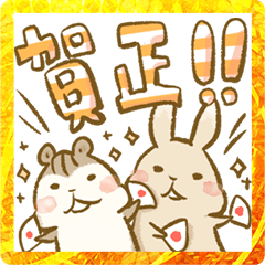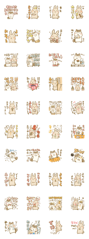 リスたむ&うさぎ(ネザーランドドワーフ)のマロンちゃんの年末年始スタンプ。お正月のあけおめメッセージ、めでたいお祝いスタンプもセットで〜。2022年の感謝を込めて。※2023/1/3(火)23:59までに購入すると特典「LINEおみくじ」がもらえます。細字ゆうか より発売