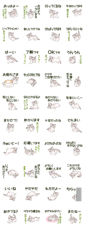 ふわふわもこもこの子猫が、リアル猫ちゃんっぽいポーズで可愛くご挨拶。よく使う言葉や思いやりの言葉が見やすい大きな文字で入っていますので、年配の方にもどうぞ。つのっち より発売