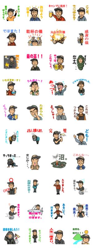 チキューギさんの元気なスタンプです。キャンプ愛が伝わるスタンプです