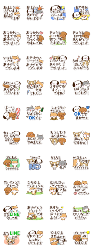 『まめシバ』『ちびイヌ』等の犬たちが、にぎやかに登場する文字いっぱいスタンプ。丁寧な言葉やいつも使うあいさつ等トイプードルやチワワ、柴いぬ好きの方に。【かたこ】