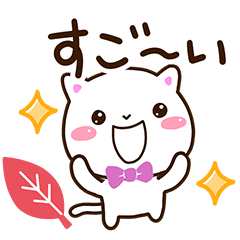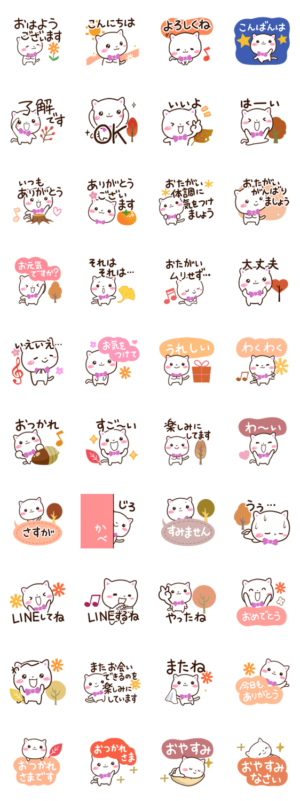 よく使う言葉やあいさつ等をまとめた白猫の秋スタンプ。基本的な文字等が、落ち葉等、秋の雰囲気の飾りと一緒に丁寧に返事をできます。しろねこ好きな方にぜひ。【かたこ】かたこ より発売