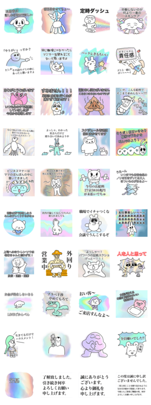 タイトル通り完全に仕事をナメてるスタンプばかり。真っ黒な会社とバトルをするには最高の素材が揃っている。