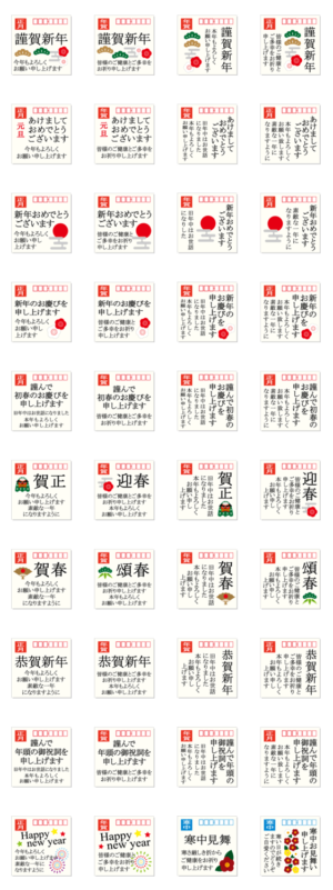 年賀状によく使う賀詞や挨拶文を厳選!上司や部下先輩や後輩親戚友人知人等どなたにも使いやすい、一般的に使える一つあれば便利な定番お正月・年賀はがき風スタンプです。※2023/1/3(火)23:59までに購入すると特典「LINEおみくじ」がもらえます。ケイ&エイセイ デザイン より発売