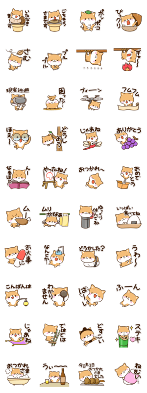 柴犬の『ちびシバ』の秋の雰囲気のイヌスタンプ。可愛く返事ができます。毎日使う言葉や、あいさつ等の、ずっと使える、秋のいぬスタンプです。【かたこ】かたこ より発売