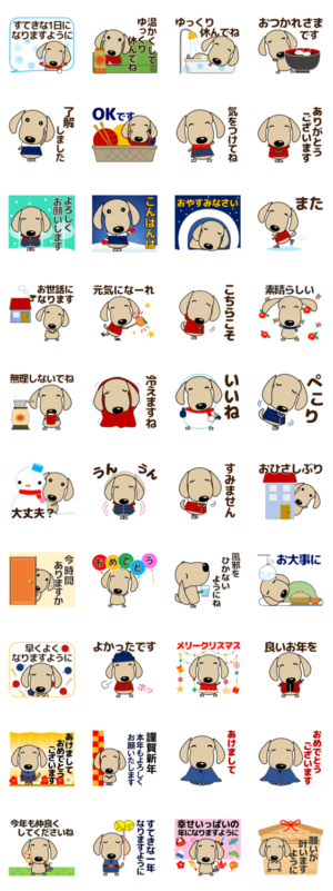 犬好き、ダックスフンド好きな方に。年賀状、あけおめ、年始の挨拶、年末、クリスマス、お正月等も。優しい気持ちがつまった日常会話に使いやすいゆるいスタンプ。敬語。