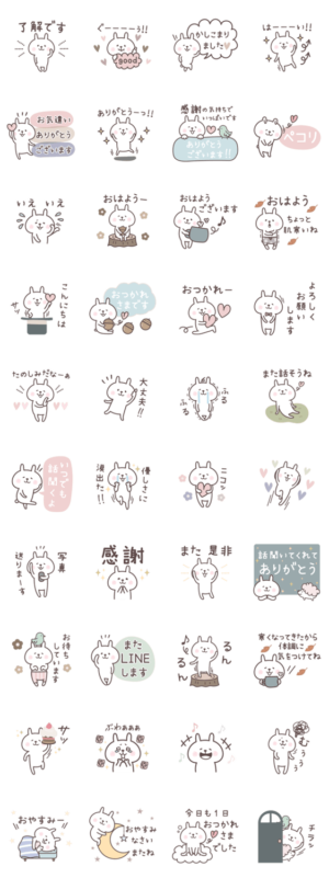 やわらかで優しい雰囲気のうさぎのスタンプ。全体的に使いやすく、また過度に華美ということもない。適度なかわいさがあるのも良い。