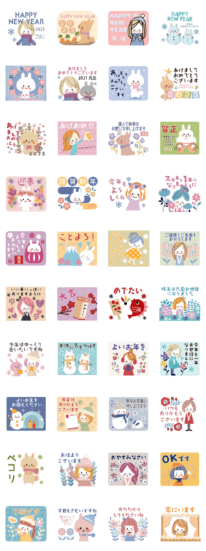 女の子とうさぎのキュートな年末年始のスタンプです。丁寧な敬語からカジュアルに使えるあいさつまで。色々な相手に幅広く使えます。※2023/1/3(火)23:59までに購入すると特典「LINEおみくじ」がもらえます。