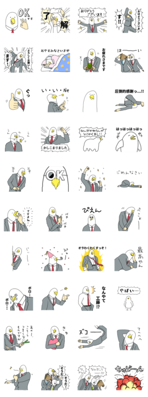 面白いのに使いやすい。敬語、大人、あいさつ、日常、かわいい、シュール、ウザい、仕事、が詰まったスーパー使いやすくてやたらカッコイイ鳥のスタンプです。