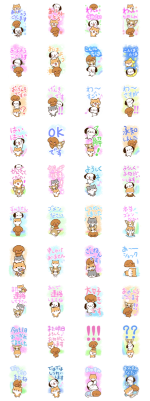 『まめシバ』『ちびイヌ』等の犬たちが、にぎやかに登場するビッグスタンプ。丁寧な言葉やいつも使うあいさつ等、トイプードルやチワワ、柴いぬ好きの方にぜひ。【かたこ】