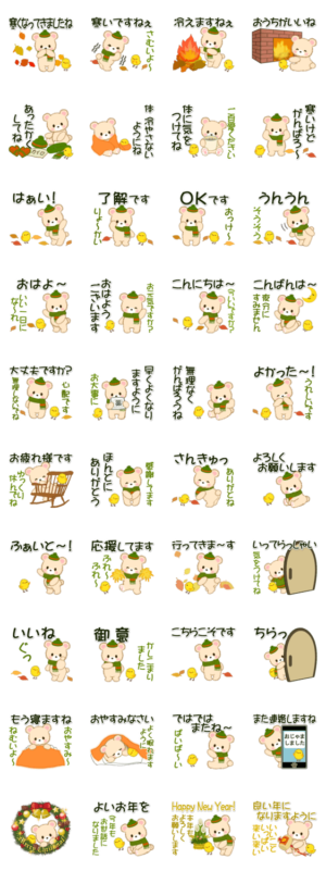 もこもこのぬいぐるみのようなクマの子と、仲良しヒヨコの、絵本のようなスタンプです。秋冬や年末年始に毎日使う言葉や気遣いの言葉が、大きめ文字で入っています。