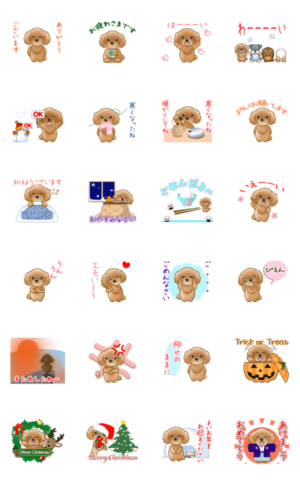 トイプードルの日常スタンプ 。冬用、ハロウィン、クリスマス、お正月もあります。ゲストにシュナウザー君、ミニチュアダックス君、コーギー君が参加しました。