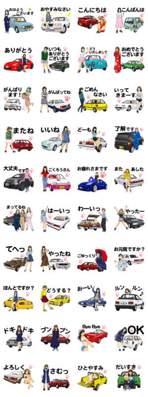 ごろんたたちとステキでかわいい女の子たちが懐かしの車に乗っておもいを伝えるスタンプの第1弾ですにゃよ!ごろんた より発売