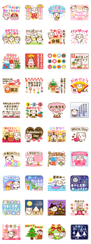 お祝い&年間行事イベントの豪華なスタンプです! お正月/おめでとう/年賀状/クリスマス/バレンタインデー/誕生日/ハロウィン/節分/父の日/母の日のイベント等 作:usakazu1※2023/1/3(火)23:59までに購入すると特典「LINEおみくじ」がもらえます。usakazu より発売