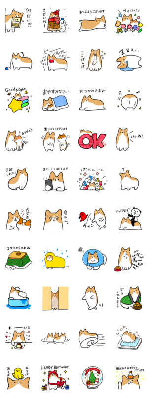 ゆるゆるのコーギー。無表情気味なお顔が時々変わる?やっぱり、この子もタコ投げちゃう。特に寒い季節に使いやすいスタンプです。まるぺ より発売
