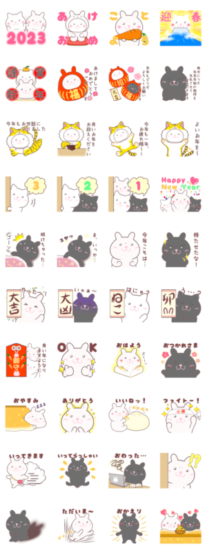 うさぎとにゃんこがあけおめスタンプでお祝いします。日常でも使えるスタンプもあります。※2023/1/3(火)23:59までに購入すると特典「LINEおみくじ」がもらえます。
