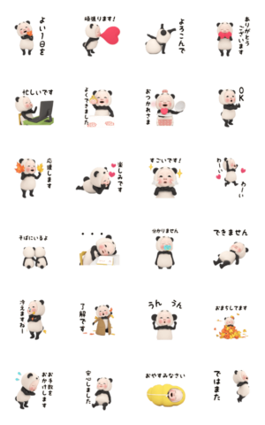 パンダの着ぐるみを着た赤ちゃんのスタンプ。どちらかと言えば海外ウケしそうな作風。メッセージの汎用性は低くなく、アニメーションのクオリティもなかなか。