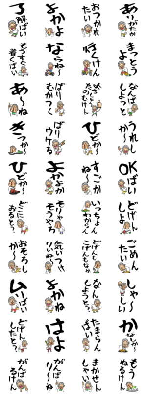 博多弁おばあさんの【デカ文字】スタンプです。文字が大きいので、すごく読みやく、わかりやすいスタンプになってます。全国47都道府県の方言スタンプも好評販売中です。 ※このスタンプはトークルームで大きく表示されるBIGスタンプです。Brody Machine より発売