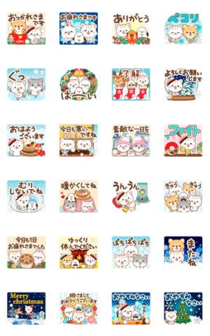 雪の結晶がキラキラと輝く綺麗な冬らしいデザインです。可愛い動物たちが優しく気遣う挨拶スタンプです♪今年はふわ感をアップしてみました。年始の挨拶・クリスマスにも