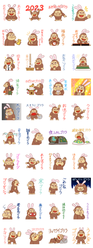 2023年の干支はうさぎゴリラ!うさ耳をつけただけでいつも通りな、ゴリラのウホホイくんのあけおめスタンプだ! その他スタンプ・絵文字・着せ替えもよろしくね※2023/1/3(火)23:59までに購入すると特典「LINEおみくじ」がもらえます。ウホホイ・ホイホーホ より発売