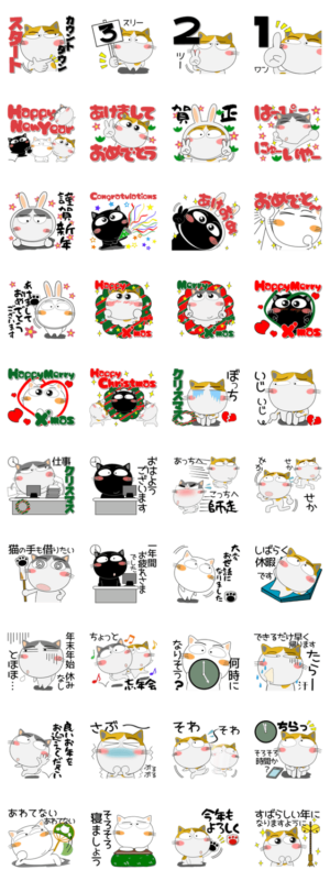 三毛猫、ハチワレ猫、黒猫、白猫が勢ぞろい!年末年始、クリスマス、お正月にお勧め。カラフルで見やすい大きな文字。スタンプ送ってハッピーな気持ちになってください。※2023/1/3(火)23:59までに購入すると特典「LINEおみくじ」がもらえます。urajo より発売
