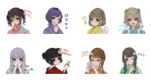推しカラーの着物姿の女の子たちの毎年使えるあけおめスタンプです。※2023/1/3(火)23:59までに購入すると特典「LINEおみくじ」がもらえます。ベストライフ より発売