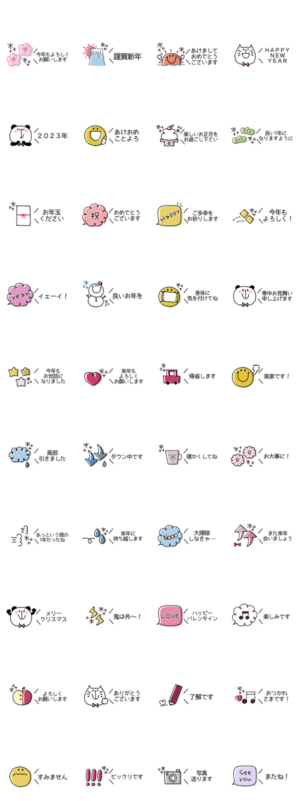 こちらのスタンプは2022年の再販になります。 1つあると便利な省スペーススタンプです。シンプル/かわいい/大人可愛い/吹き出し/スマイル/ねこ/あいさつ/パンダ/冬/正月