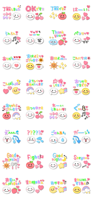 派手可愛いレインボー♡プックリ可愛い無難なスマイル日常会話セットです。 ハート多め/かわいい/家族/カップル/大人可愛い/敬語 販売情報ちゃぴ より発売
