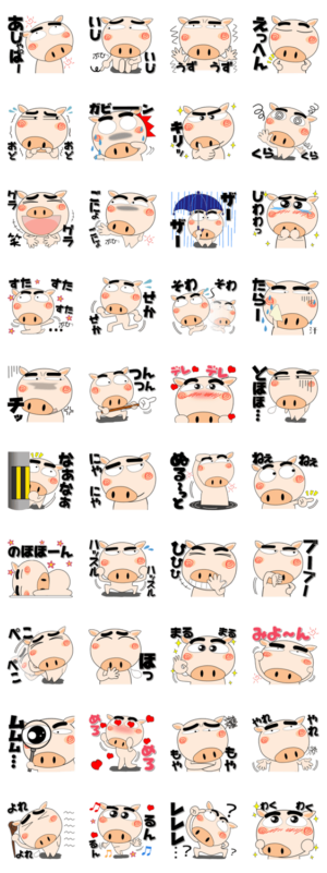 まゆ毛が特徴的な愛らしいブタのスタンプ。擬音語・擬態語を「あいうえお順」に揃えました。シーンに合わせてすぐに返信できます。うれしい、たのしい、毎日使える。