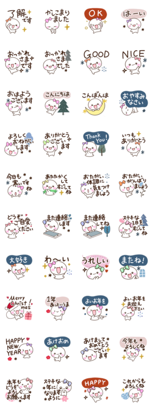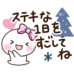 リボンを付けた可愛い『しろりぼん』の冬の雰囲気のスタンプ。よく使うあいさつや、年末年始の言葉等、使いやすくかわいいスタンプ。まるくて可愛いキャラです。【かたこ】かたこ より発売