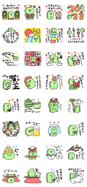 2023年☆卯年。シュールなミニ恐竜のあけおめスタンプです。※2023/1/3(火)23:59までに購入すると特典「LINEおみくじ」がもらえます。