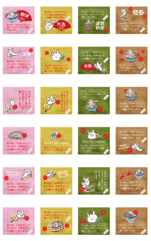 お正月用兎(うさぎ)メッセージスタンプ。長く続くうどんとうさぎを合わせた縁結びや恋愛運も上がりそうな縁起物です。2023年(令和5年)干支はうさぎ年(卯年)※2023/1/3(火)23:59までに購入すると特典「LINEおみくじ」がもらえます。 現在この商品は一部のスマートフォン版LINE 10.3.0以上のトークルームでのみ使用できます。動作環境の最新情報はヘルプをご確認ください。