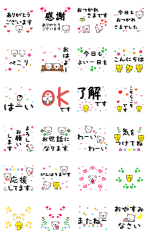 日常使える敬語中心でシンプルな飛び出すスタンプです。挨拶に!お友達・家族・お仕事に使えます。(くま・ねこ・ペンギン・とら・ひよこ達が登場!)