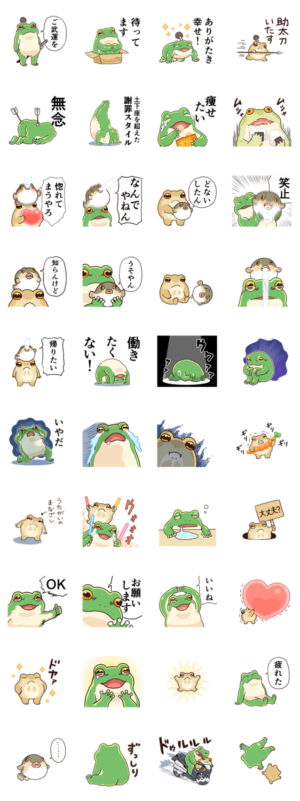 フグの表情が激しいという言葉にぴったりだと思いました(笑)武士口調のカエルもかわいいし、友達との間で使いやすそうです!